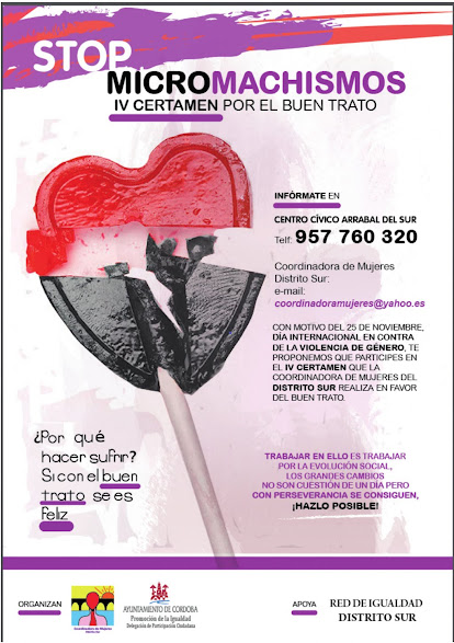 Con motivo del 25 de noviembre, Día Internacional en contra de la violencia de género, te proponemos que participes en el IV Certamen que se realiza en favor del buen trato, organizado por la Coordinadora de Mujeres Distrito Sur, la Delegación de Promoción de la Igualdad y la Delegación de Participación Ciudadana, con el apoyo de Red de Igualdad- Distrito Sur.
