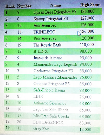 Enhorabuena a los alumnos y alumnas de nuestro centro, que una vez más, con nerviosos, algunos muchos, defendisteis estupendamente el proyecto científico y el panel de los valores, competisteis con los robots haciendo las misiones como profesionales, obteniendo un tercer y quinto puesto, ¡olé!, y sobre todo, enhorabuena a mis “robóticos-informáticos”, me encantó ver cómo lo hicisteis y me sentí muy orgullosa de vosotros.