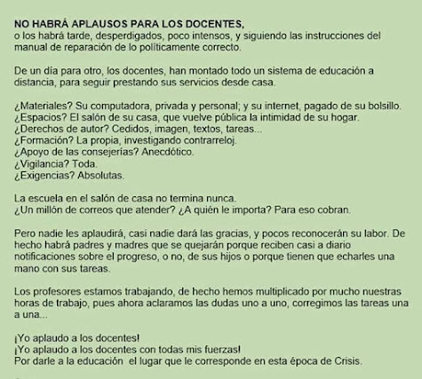 Y si, estoy 100% de acuerdo con esta imagen, que alguien especial me mandó, pero, la verdad, no necesito aplausos, no necesitamos aplausos, sino que respetéis nuestra labor padres/madres y nuestr@s alumn@s...
